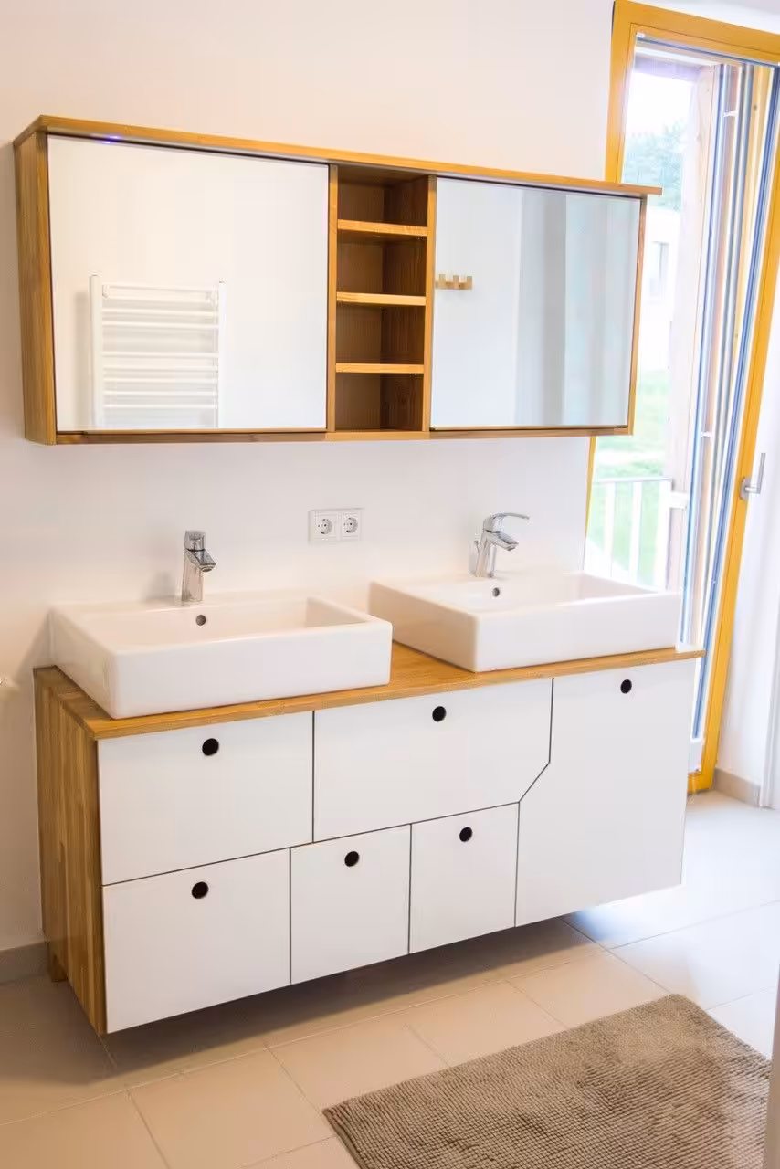 Gerade in kleinen Bädern zählt jeder Millimeter. Unsere maßgefertigten Waschtischunterschränke und Spiegellösungen nutzen Nischen clever aus und sind speziell für Badezimmer konzipiert. Verwandeln Sie Ihr Bad von der Nasszelle in ein privates Spa mit Charakter.